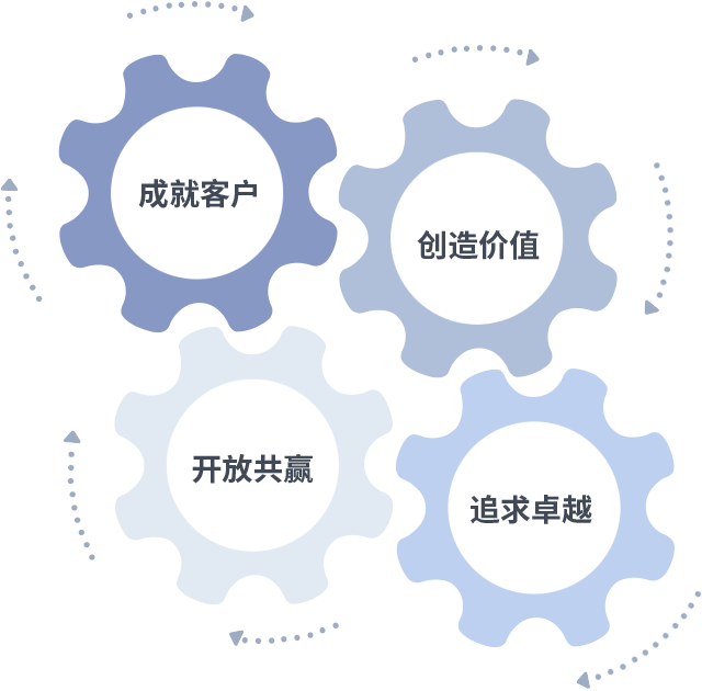 成就客户是一切决策的出发点,,,,创造价值是衡量所有工作的标准,,,,追求卓越是我们做事做人的态度,,,开放共赢是我们的格局也是最终的结果。。。价值观的齿轮环环相扣,,,推动着组织里的每个人不断向前。。。。